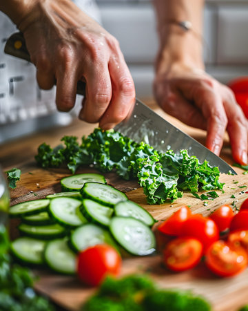 A close-up shot capturing the process of preparing a fresh and colorful salad. The image showcases hands skillfully chopping kale and other garden vegetables on a wooden board, emphasizing healthy eating and the culinary preparation of a nutritious meal.