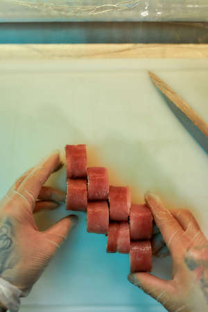 Top view of hands of chef arranging sliced tuna sushi while preparing rolls on a board at commercial kitchen