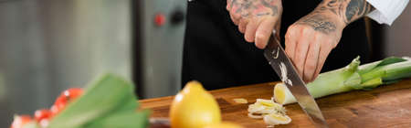 Cropped view of chef cutting leek near blurred vegetables in kitchen, banner