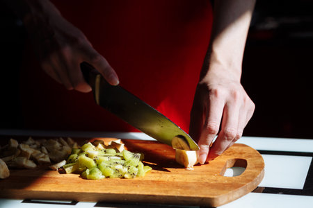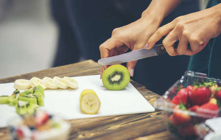 Woman hands slicing kiwi fruit, cutting citrus fruits. knife cutting board, juice squeezer, with strawberry and banana on wooden table. food and healthy concept