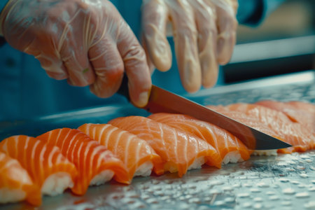 Skilled experienced japanese master chef preparing sushi rolls traditional cuisine restaurant bistro slicing fresh salmon fish tasty delicious gourmet dish seafood rice cook preparing order