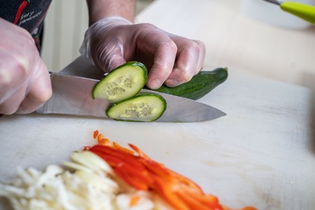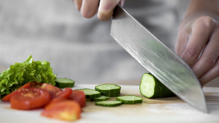 Cutting a cucumber with a long knife