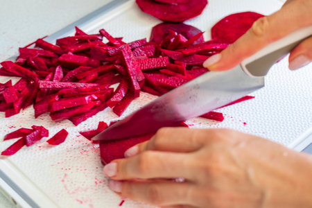 Professional chef cutting beet-root on wooden plank