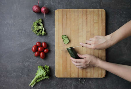 Hands cut cucumber on a cutting board on a gray table. Fresh vegetables, tomatoes, lettuce, broccoli, radishes lie nearby