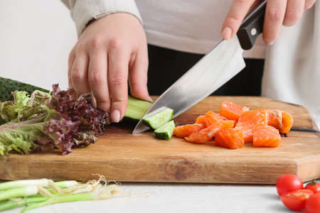 Unrecognizable woman cutting cucumber on wooden board close up