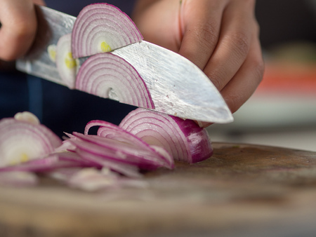 Close-up chef is cutting red onion