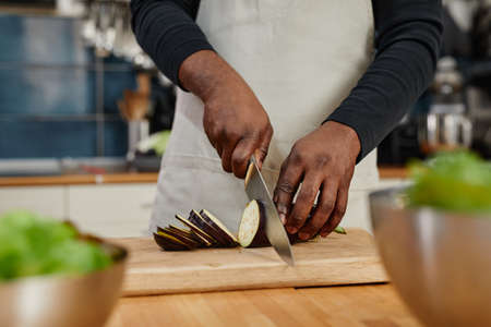 Close up of unrecognizable African-American man cutting aubergine while cooking dinner at home, copy space