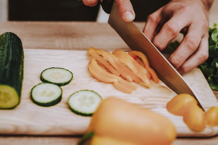 Man is Cooking Salad from Vegetables. Man is Cutting the Yellow Pepper. Person Cutting with a Knife on Wooden Board. Fresh Vegetables on Wooden Table. Person Located at Home. Table Closeup.