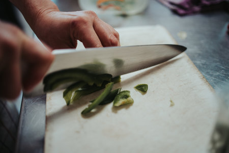 a cook slicing the green bell pepper on the wooden tray