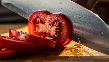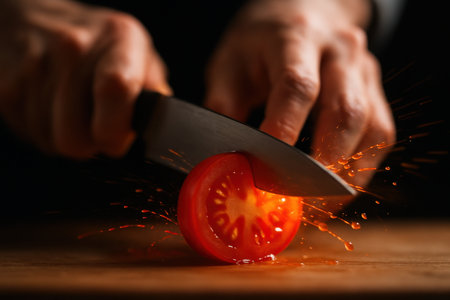 Chef hand cutting a vibrant red tomato with a sharp knife on a wooden board, creating dynamic splashes of juice. Focus on fresh ingredients, culinary preparation, and healthy eating.