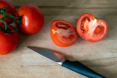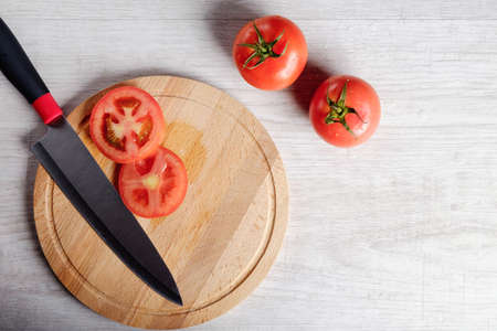 Ripe tomato slices on wooden surface Half part right side with knife top view