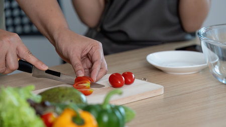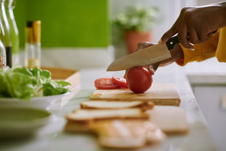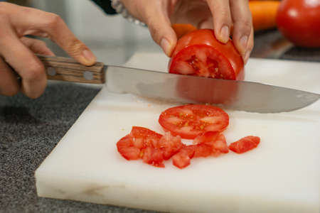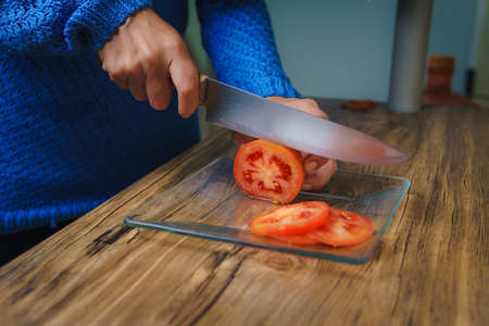 Close-up of hand of unrecognizable woman cutting fresh tomato using kitchen knife on wooden cutting board. Young woman cutting fresh organic tomato with a knife for vegetable salad.