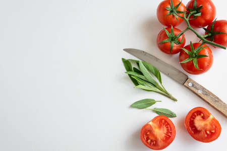 Healthy food background - raw tomatoes and wild herbs on white background, vibrant colours, vitamin food