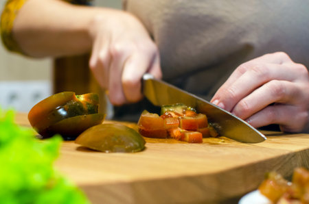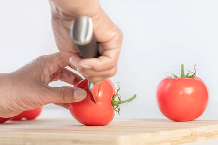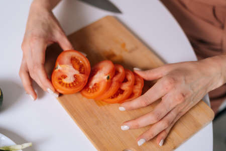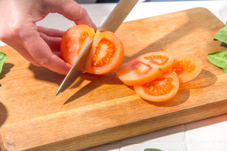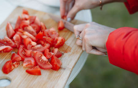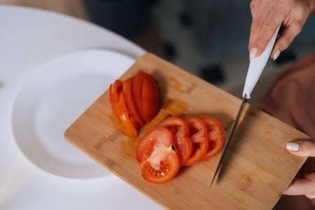 Close-up of a woman's hand cutting a fresh tomato with a kitchen knife on a wooden cutting board. Young woman cutting fresh organic tomatoes with a vegetable salad knife