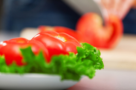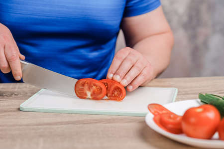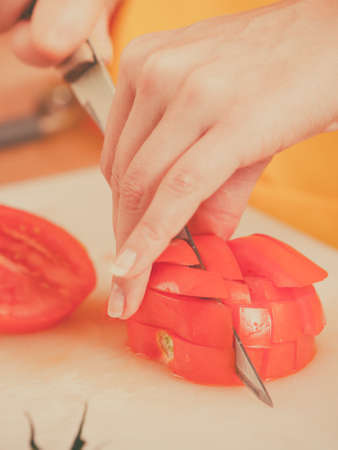 Woman cutting fresh tomato: Selective focus. Diet and healthy food concept