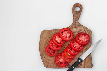 Sliced tomatoes isolated on a wooden board on a white background, top view, copy space