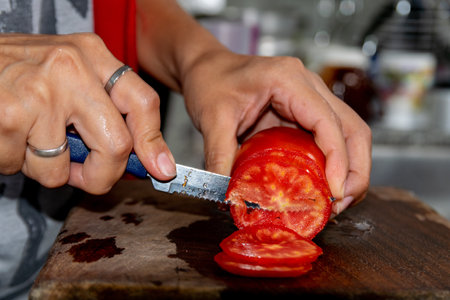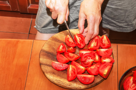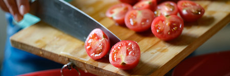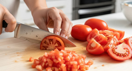 Hands slice fresh tomatoes on a cutting board with a knife, ready for cooking and adding a burst of summer flavor to a meal Perfect for food blogs and culinary projects.