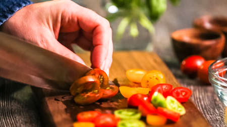 The chef is slicing cherry tomatoes with piles of ripe cherry tomatoes on a wooden cutting board while standing in the kitchen. Healthy fruit and food eating concept. close-up photo