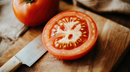 A closeup view of a freshly sliced tomato on a wooden cutting board, showcasing its vibrant red flesh and juices, perfect for culinary presentations.