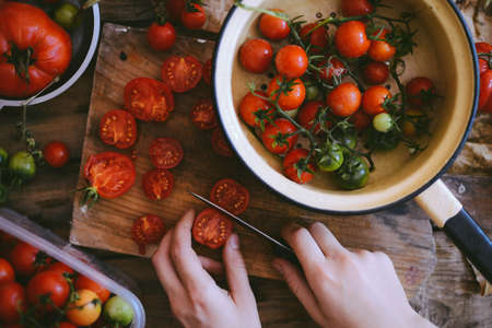 Step by step. Slicing heirloom cherry tomatoes on wood cutting board.
