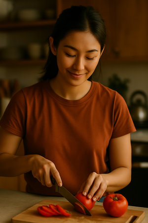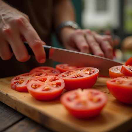 A close-up view of a chef's hand slicing ripe red tomatoes on a wooden cutting board. The scene captures the essence of fresh cooking in a modern kitchen.