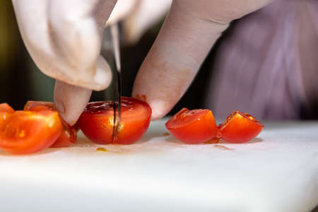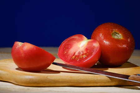Branch a tomato on a chopping board with a knife and cut a tomato