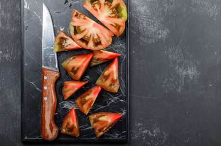 Kumato tomato slices with knife on grunge and cutting board background, flat lay.