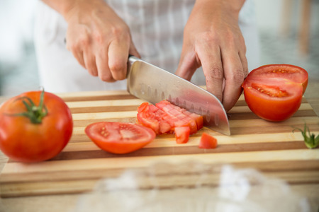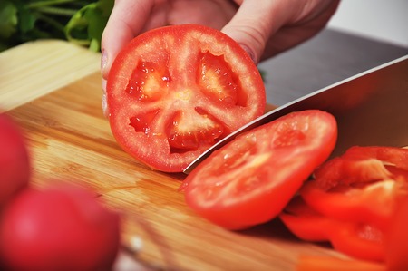 Cutting red tomato with a knife on a cutting board. Selective focus.
