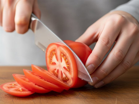 A close-up view of a person's hands using a sharp knife to slice a ripe, red tomato into thin rounds on a rustic wooden cutting board. Perfect for cooking and healthy eating concepts.