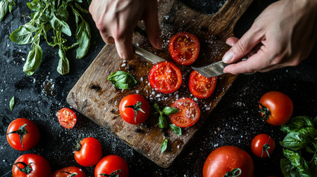 Hands cutting ripe tomatoes on a rustic wooden cutting board, surrounded by fresh basil leaves. Represents cooking, healthy eating, and organic food preparation.
