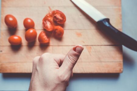 Young man finger cut while cooking a lunch, bleeding, cooking injury