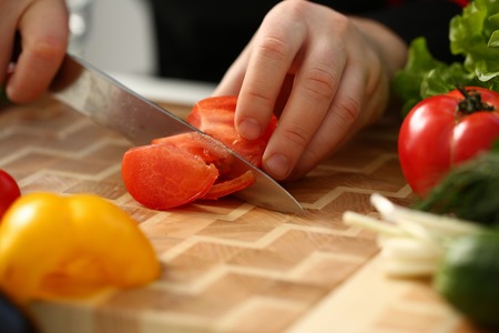 Healthy eating, vegetarian food, cooking, dieting and people concept. Close up woman hands in kitchen at home preparing fresh salad slicing vegetable red tomatoe on cutting board