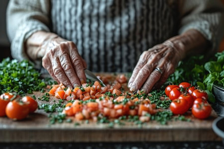Elderly Hands Preparing Fresh Tomatoes and Herbs on Rustic Wooden Table, Food Photography