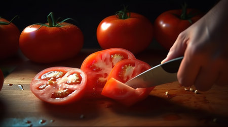 Close-up of chef's hand slicing ripe red tomatoes on a wooden cutting board, preparing ingredients for a delicious meal
