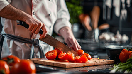 A chef slicing juicy tomatoes with a sharp knife on a cutting board in a kitchen.