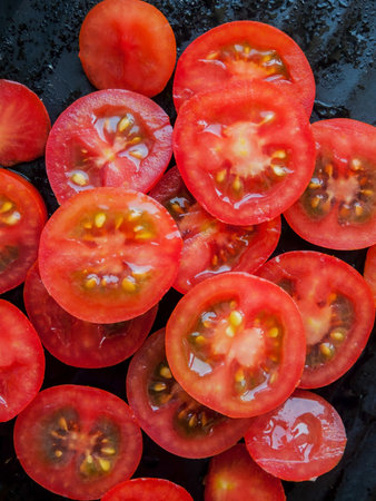 Seasonal diet and nutrition, healthy eating concept. Bunch of sliced fresh red cherry tomatoes on the black background, top view of tomatoes in the bowl covered with water drops.