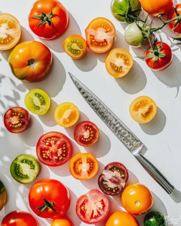 Freshly cut tomatoes on a white surface, showcasing vibrant colors and textures, with a knife placed nearby. Concept of healthy eating and culinary arts.