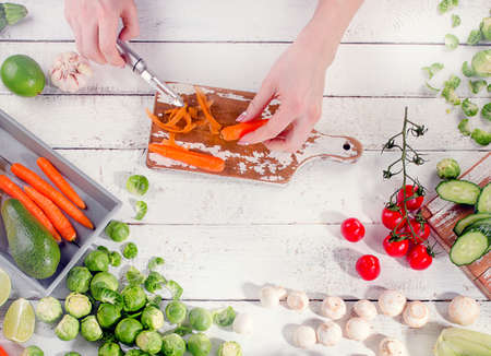 Woman cutting carrots on a wooden board to prepare a healthy salad