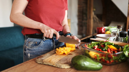 Female slicing pepper for salad. Close up chef cutting vegetables.