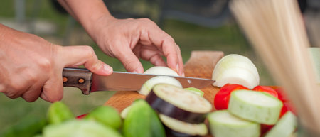 girl slices vegetables on the board and prepares a salad on the nature outside. sunny day and cooking. close-up view.