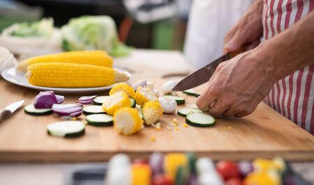 Preparation vegetable salad. Woman preparing food on table at backyard. Making vegetarian food