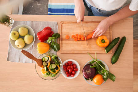 Lady chief chopping vegetables on table, cooking delicious fresh salad for lunch