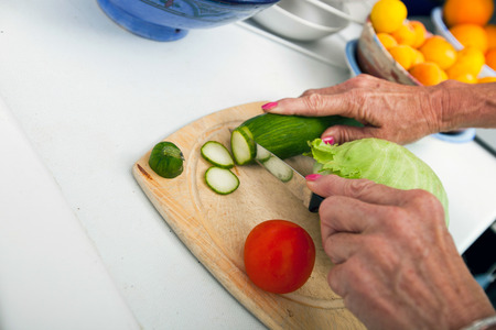 Cropped image of senior woman cutting vegetables on chopping board in kitchen