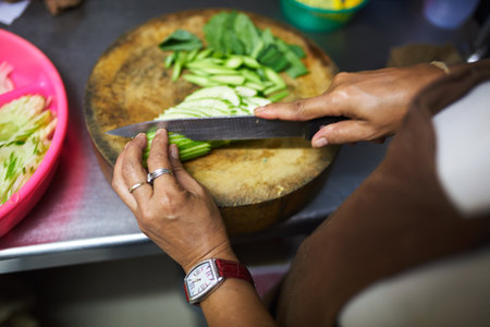 Chef cuts a cucumber on a cutting board, Hanoi, Vietnam. Close-up
