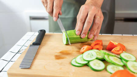 The woman in the process of making vegetable salad. Closeup of hands cutting cucumber on wooden cutting board