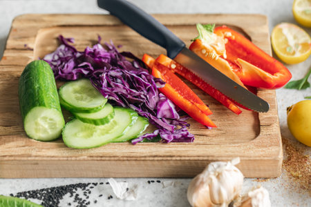 Sliced cabbage, bell pepper and cucumber on a wooden kitchen board.