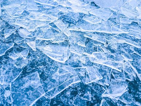 Close up of pieces of ice on frozen lake or river. Shatters of cracked ice closeup. Broken ice on the lake. Winter background.