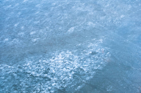 Ice on frozen lake with pieces of snow, close up detail - winter background.