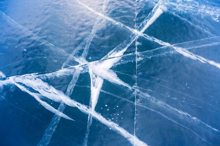 Blue ice on the frozen lake. Cracks on the ice surface. Beautiful winter background.