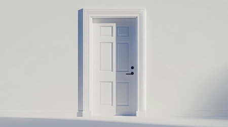 A serene and modern 3D illustration of a white door set in a bright, minimalist space, showcasing elegance and simplicity in design. Perfect for various art and design projects.
